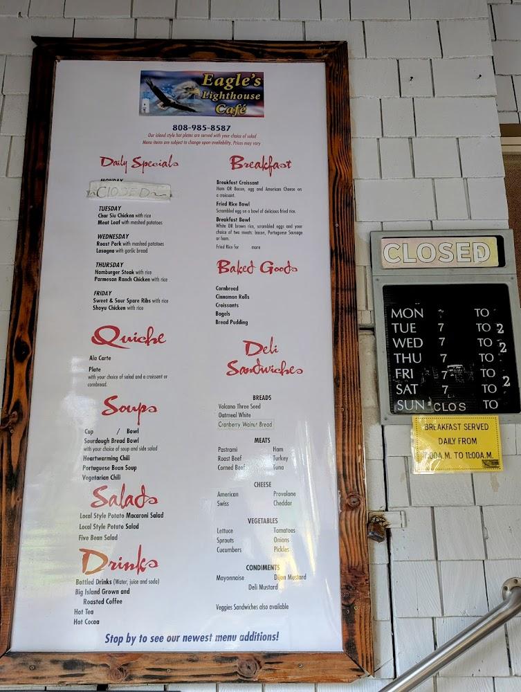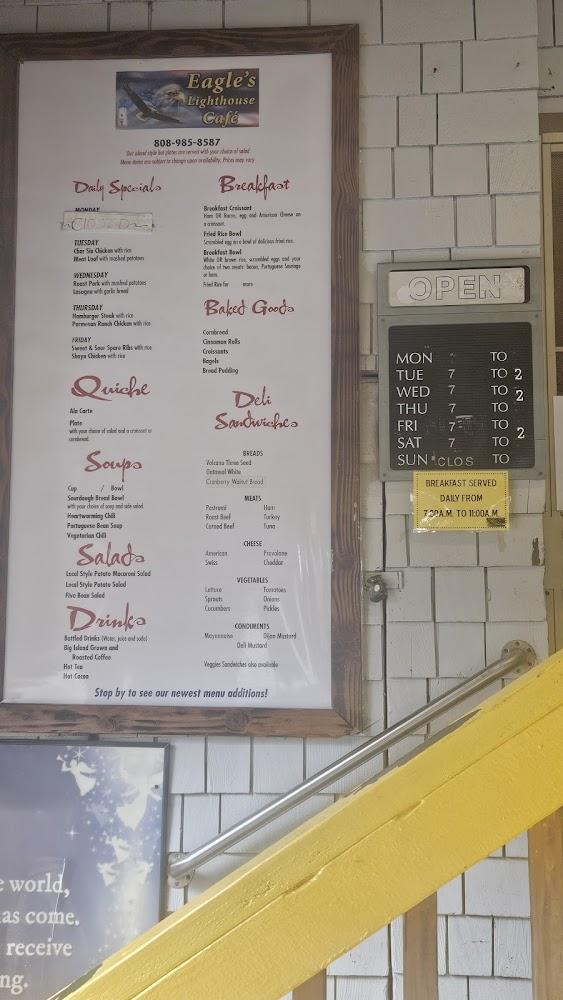 Welcome to Eagle's Lighthouse Cafe, your go-to spot in Volcano, HI, for a delightful dining experience surrounded by nature. Our café provides a relaxed atmosphere with outdoor seating and counter service, specializing in fresh sandwiches, traditional breakfasts, and aromatic espresso. Whether you're enjoying a solo meal or gathering with friends, our menu features local specialties and vegetarian options. We pride ourselves on friendly service, a cozy vibe, and a convenient location, complete with accessible parking. Join us for breakfast, lunch, or a quick bite, and savor the flavors of Hawaii in a tranquil setting.
